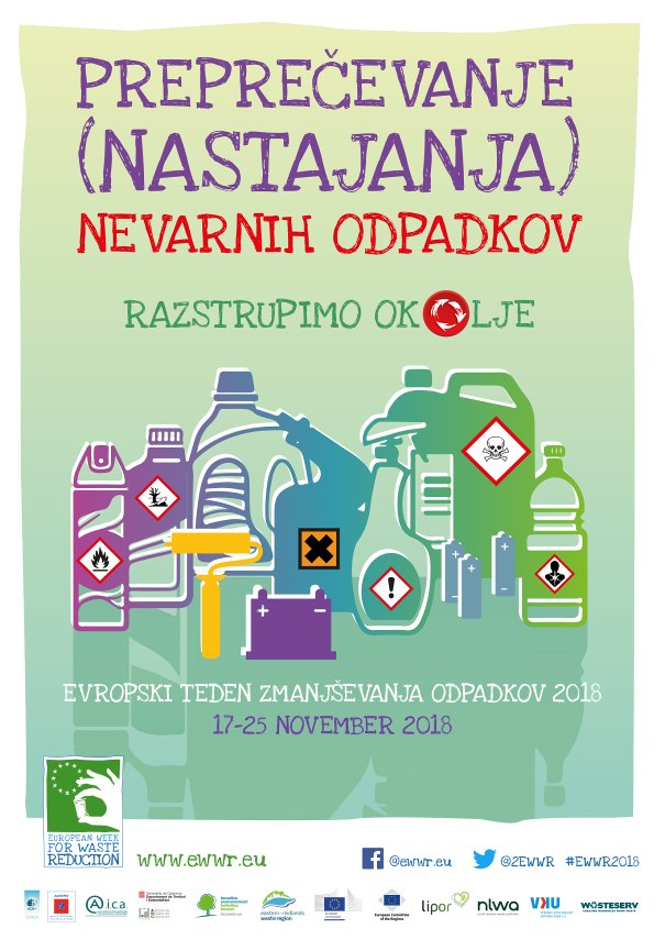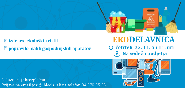 Cilj letošnjega Evropskega tedna zmanjševanja odpadkov je zmanjšati količino nevarnih odpadkov, preprečiti njihovo nastajanje in spodbujati pravilno ravnanje z njimi. V sklopu tedna zmanjševanja odpadkov bomo v četrtek, 22. 11. ob 11 uri organizirali delavnico, kjer bomo izdelali ekološka čistila in popravljali male gospodinjske aparate. Prosimo vas, da se na delavnico prijavite do ponedeljka, 19. 11. 2018, saj je število mest omejeno.