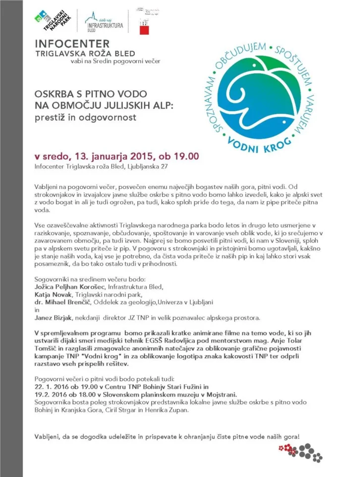 Vabljeni na pogovorni večer, posvečen enemu največjih bogastev naših gora, pitni vodi. Od strokovnjakov in izvajalcev javne službe oskrbe s pitno vodo bomo lahko izvedeli, kako je alpski svet z vodo bogat in ali je tudi ogrožen, pa tudi, kako sploh pride do tega, da nam iz pipe priteče pitna voda. Pogovorni večer bo potekal v Infocentru Triglavska roža Bled, v sredo, 13. januarja 2016, ob 19. uri.