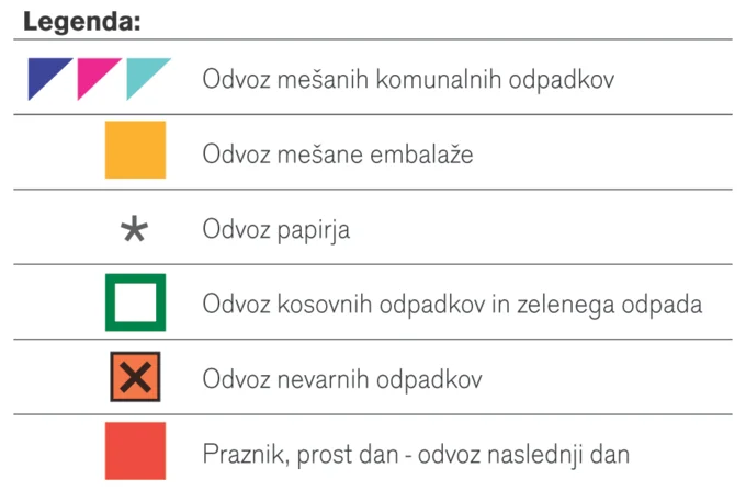 Odvozi odpadkov na datume v rdečih kvadratkih (praznik) se vedno prenesejo na naslednji dan.