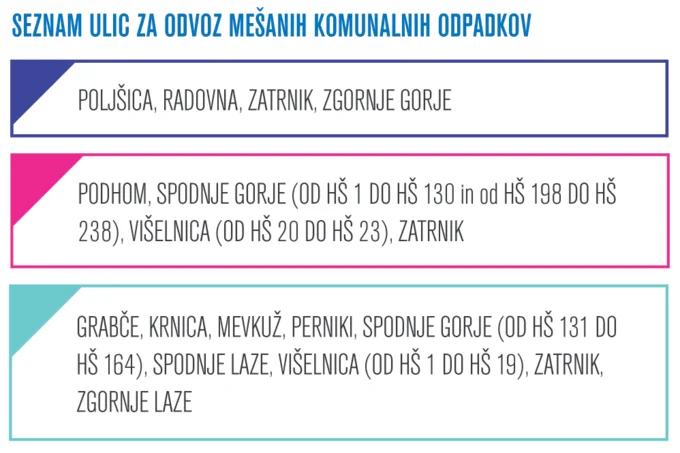 Odvozi mešanih komunalnih odpadkov v občini Gorje (razdeljeno na 3 območja) potekajo vsakih 21 dni.