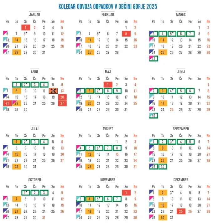 Termini odvoza zabojnikov za papir so v občini Bled označeni z zvezdico in ustrezno barvo (1. odvoz za Alpsko cesto je 22. 1. 2025), v občini Gorje pa le z zvezdico (1. odvoz za Poljšico je 8. 1. 2025).