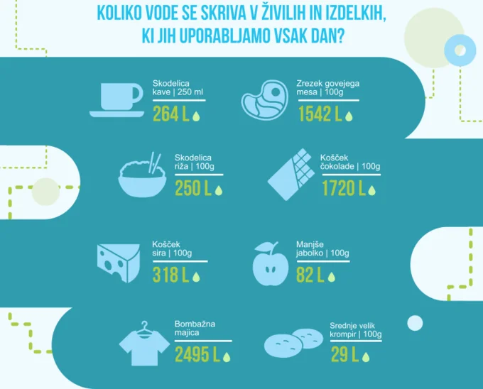 Komunalna podjetja so se zato odločila, da prebivalce opozorijo na to problematiko in pokažejo koliko vode se skriva v živilih ter dobrinah, ki jih trošimo vsak dan.