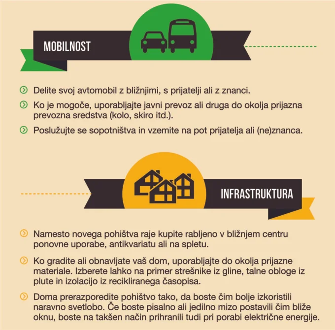 - Ko je mogoče, uporabljajte javni prevoz ali druga do okolja prijazna prevozna sredstva (kolo, skiro itd.).